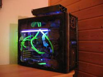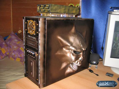 Внимания заслуживает вырезанное особым образом в левой боковине окно, выглядящее так, как будто края обожжены или расплавлены . На верхней части кейса умелец разместил радиатор для системы водяного охлаждения. Покраска также не вызывает никаких нареканий, все выполнено качественно и с творческим подходом.