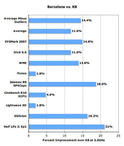 Результаты сравнения тестового Quad-Core Opteron 2,5 ГГц с Opterons K8 приведены ниже на диаграмме.