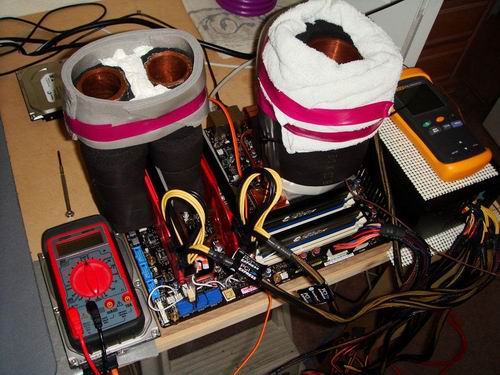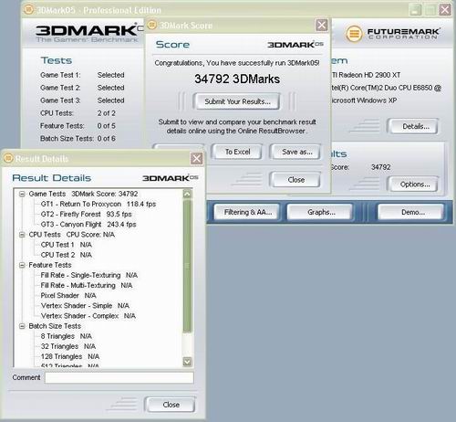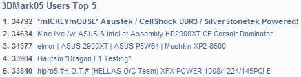 Рецепт рекорда достаточно прост. В качестве платформы была выбрана материнская плата Asus Blitz Extreme. Энтузиаст, с известным всем детям именем, разогнал процессор Intel Core 2 Duo E6850 до частоты 5190 МГц при помощи жидкого азота и подаваемом напряжении 1,7 В. Добавил память DDR3 PC14400 CellShock работающую на частоте 923 МГц с таймингами 7-6-5-15 при рабочем напряжении 1,95 В. Разумеется, для достижения максимального результата в 3DMark 05 были использованы две видеокарты Radeon HD 2900ХТ, производства Asus и разогнанные до 1204 МГц по ядру и 1012 МГц по памяти. За снабжение энергией столь мощной системы отвечал блок питания Silverstone OP1200.В итоге успех не заставил себя долго ждать - 34792 "попугаев".