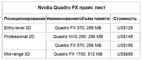 nVidia Quadro решения широко доступны через изготовителей систем, таких как Hewlett Packard (HP), Dell, IBM, Lenovo и Sun. Цены и наименования моделей анонсированных видеокарт Quadro FX приведены в таблице: