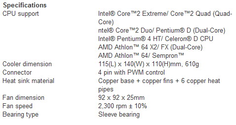 Как вы помните, четырёхъядерные процессоры могут выделять рассеиваемую мощность порядка 130 Вт, поэтому для их охлаждения многим понадобится тихое и надёжное решение. Уровень шума Silent Knight II не превышает 25 dBA, материал, из которого сделан кулер – медь. Медные тепловые трубки эффективно отводят тепло от основания к рёбрам, где горячий воздух рассеивается 9 см вентилятором.