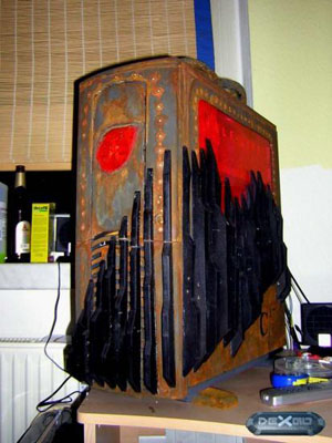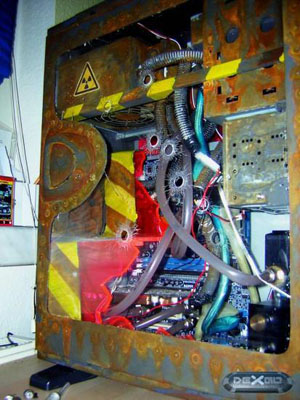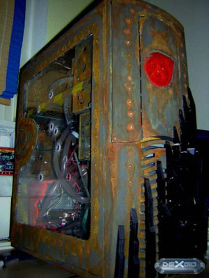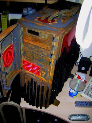 Технологический процесс включил в себя подготовку кейса к покраске, резку окон, раундинг всех проводов системы, наклейку декоративных элементов на переднюю и боковую панели. Также стоит отметить пулевые отверстия, которые были сделаны с помощью дремеля на куске оргстекла.