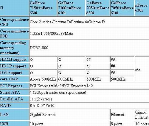 Все графические ядра поддерживают DirectX 9 и Shader Model 3.0, сами чипсеты будут поддерживать процессоры с частотой шины 1333/1066/800 МГц, включая Penryn, а также будут снабжаться одноканальным контроллером памяти, работающим с DDR2-800 SDRAM. При этом есть поддержка одного PCI-E x16, двух PCI-E x1, четырех SATA II, двух PATA и RAID. Логика nForce 630i поддерживает Gigabit Ethernet, десять портов USB и RAID 0, 1, 0 + 1 и 5. А вот nForce 610i только 10/100 Ethernet, восемь портов USB и RAID 0/1.