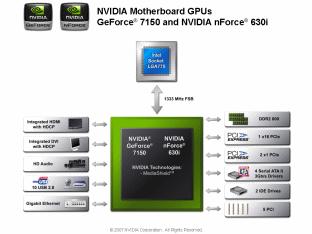 Сегодня nVidia наконец-то официально анонсировала новый набор системной логики со встроенным графическим ядром для платформы Intel. Итак, чипсеты, ранее известны под кодовым именем MCP73, получили наименования - GeForce 7150+nForce 630i, GeForce 7100+nForce 630i, GeForce 7050+nForce 630i, GeForce 7050+nForce 610i, с номинальными частотами графических ядер - более 600МГц, 600МГц и по 500МГц у GeForce 7050 соответственно. Также был представлен nForce 630i - чипсет без графического ядра GeForce 7.