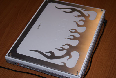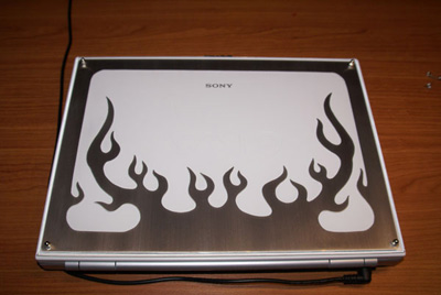 В качестве объекта моддинга послужил ноутбук мастера, который, по его мнению, выглядел скучно и невзрачно. После долгих раздумий, автор решил уделить максимум внимания украшению передней панели корпуса языками пламени. Пламя он вырезал из небольшого листа нержавеющей стали.