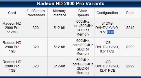 Исходя из таблицы, видеокарты Radeon HD 2900 PRO будут комплектоваться разным объемом локальной памяти. Причем версии с 1 Гб памяти не всегда будут быстрее. Поскольку частота работы памяти одинакова и равна 800 МГц. Но, зная, что задержки у DDR 4 выше, чем у DDR 3 - особого смысла в переплате равной 50 $ за дополнительные 512 Мб я не вижу. Разумеется, что версия с 1 Гб памяти пригодится для обладателей мониторов с большой диагональю. Почему две версии Radeon HD 2900 PRO 1 Гб? Разная длина PCB равная 24 см и 31,5 см.