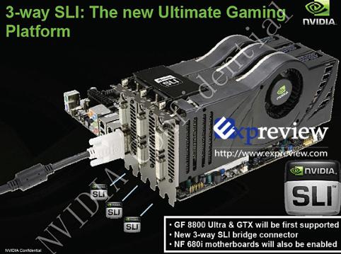 Но как оказалось nVidia и этого мало. Сегодня стала доступна информация о том, что nVidia готовится представить новый режим подобного толка – объединение на одном компьютере трех видеокарт в режиме SLI. При этом, как ожидается, поддержка данного режима будет реализована в новых чипсетах от nVidia – 780i SLI, 780a SLI и 790i. Чипсет 680i, который имеет три слота PCI Express 16x, но на данном этапе не имеет поддержки трех видеокарт в режиме SLI, получит данную поддержку в новых драйверах после официального анонса нового режима SLI.