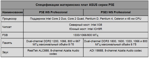 Компания ASUS выпускает на рынок две новые материнские платы P5E WS и P5E3 Professional , основанные на системной логике Intel X38. Данные продукты предназначены для поклонников высокопроизводительных и надёжных решений, характеристики новинок впечатляют: поддержка системной шины FSB 1333 МГц, широкий спектр устанавливаемых процессоров – от Celeron до грядущих 45 нм CPU, два слота PCI-e x16 ревизии 2.0 с увеличенной вдвое пропускной способностью 5 Гбит/с.