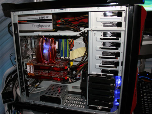Три слагаемых Phenom + RD790 + RV670 компания AMD именует не иначе, как "Spider", что означает «Паук». Временным местом обитания этого «насекомого» стал корпус Thermaltake с блоком питания 1000 Вт, который вместил в себя: AMD Phenom (Engineering Sample CPU), материнскую плату производства Sapphire на чипсете RD790, 2 Гб оперативной памяти Super Talent DDR2-1066 и две видеоплаты на ядре RV670.