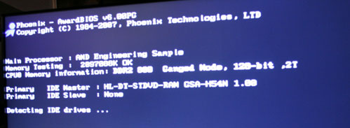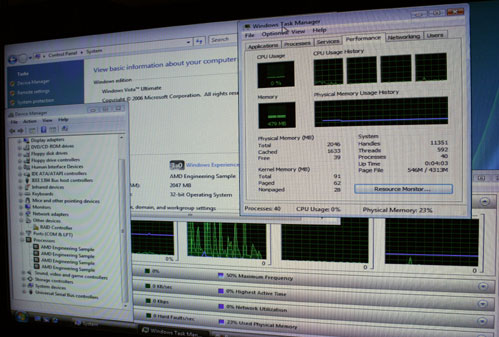 Как мы можем видеть на скриншоте, система опознала четырёхъядерный Phenom не иначе как AMD Engineering Sample. По данным специалистов сайта Inquirer тестируемый CPU без проблем стартовал на собранном ПК, но не распознавался должным образом многими утилитами. К тому же тестовая система не захотела работать под управлением 64-битной Windows Vista, зато без проблем запустилась и стабильно работала с её 32-битной версией.