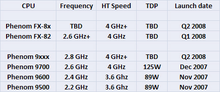 При этом стала известно, что двухъядерные процессоры Phenom будут выпускаться под именем Athlon (первые два процессора будут называться Athlon 6250 и Athlon 6050), но появятся они только во втором квартале 2008 года, после выхода трехъядерных Phenom 7 серии.