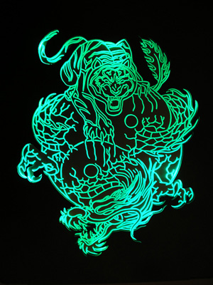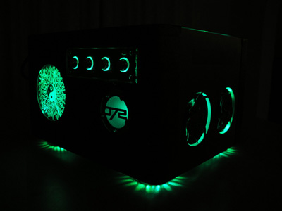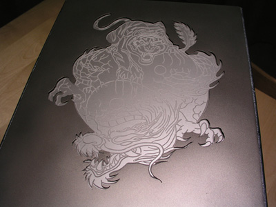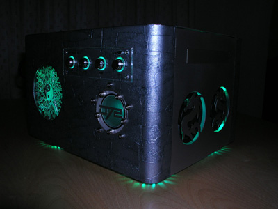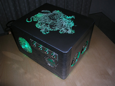 Шикарная выгравированная композиция битвы дракона с тигром украшает верхнюю панель кейса. Несколько слов о процессе покраски Перед тем как нанести завершающий слой краски, умелец обклеил корпус небольшими кусочками бумаги, тем самым, придав поверхности необыкновенную фактуру и объем. Чтобы еще больше подчеркнуть каждую деталь, Drago72 использовал зеленую подсветку. В конечном итоге старый и невзрачный корпус просто преобразился. Удачное сочетание света, стиля работы и потрясающей гравировки делает работу шедевром моддинг-искусства.