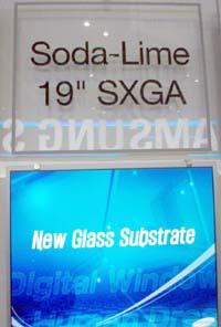 На японской выставке, FPD International 2007 в Йокогаме, компания представила 19-дюймовые панели, в которых используется «новый» тип стекла – Soda-Lim (натрий-кальций-силикатное, или, проще говоря – обычное стекло, которое стоит у вас в окне). Основные компоненты данного стекла являются двуокись кремния, оксиды натрия и кальция, и при этом его толщина, составляет всего 0,5-0,7 мм, что не влечет за собой увеличения размеров самого мониторов. Но самое главное то, что данные мониторы показывают тот же уровень качества, что и традиционные. Так например, мониторы показанные на выставке имели следующие характеристики: яркость 300 кд/м2; контрастность 1000:1; цветность 72% (по шкале NTSC) и приемлемые углы обзора.
