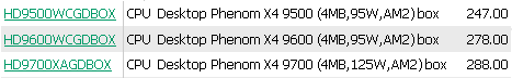 И сегодня многих порадовала информация сайта ISA Hardware, который в своем прайс-листе добавил новые процессоры AMD. Так цены Phenom, которые по логике вещей должны быть несколько выше, чем цены на Athlon 64 X2, оказались практически сопоставимы с процессорами сегодняшнего поколения. Это косвенно свидетельствует о том, что после выхода Phenom, AMD будет снижать ценны на остальные процессоры
