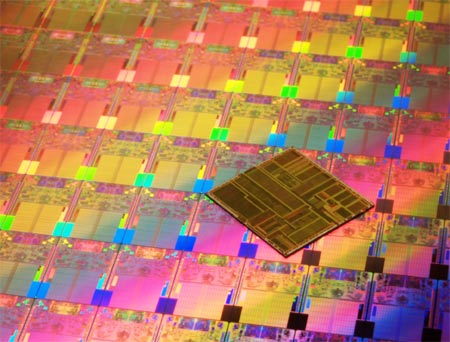 Благодаря переходу на новый техпроцесс удалось увеличить плотности компоновки практически вдвое. Так, например, на рисунке ниже мы сможем в этом убедится – на пластине с чипами новых четырехъядерных процессоров имеющих 820 миллионов транзисторов, для сравнения размещен чип процессора Pentium, который имеет только 3,1 млн. транзисторов.