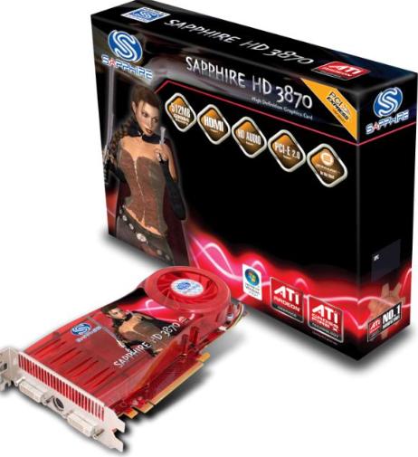 Первая, Sapphire HD 3870, имеет референсный дизайн с двухслотовой системой охлаждения, которая должна обеспечить эффективное охлаждение даже на максимальных нагрузках при разгоне. Видеокарта оснащена GDDR4 памятью, объемом 512 Мб с частотой 1125 МГц (эффективная - 2,25 ГГц). Частота ядра составляет 775 МГц, т.е. основные характеристики практически ничем не отличаются от референсных.