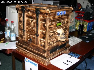Все необходимые компоненты для стабильной работы системы умелец разместил на дне конструкции. На верхней части кейса он вырезал небольшое окно. Стоит также отметить фигурные стальные петли, на которых крепятся боковые панели кейса. На передней стороне [NBL] Bishop установил две информационные панели, отображающие информацию о внутреннем состоянии системы. Тем не менее, изюминкой всей работы является миниатюрная копия человеческого черепа, играющая роль специфического декоративного элемента.