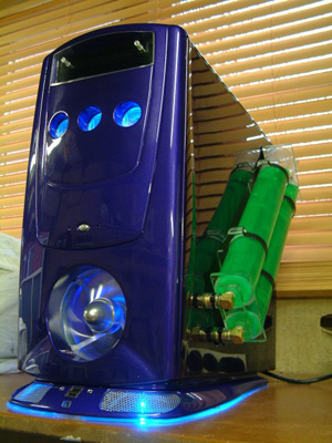 Долго думая с чего начать, умелец решил не менять кардинально внешний вид выбранного им в качестве основы кейса, а лишь поработать над добавлением некоторых декоративных элементов. Первым делом Defyant очистил поверхность от старой краски и нанес грунтовку, и, тем самым, подготовил поверхность к покраске. Потом моддер вырезал на передней панели отверстие под информационную панель, которая отображает внутреннее состояние системы и отверстие для 12-см светящегося вентилятора. Особое внимание уделил умелец разработке и установке системы водяного охлаждения.