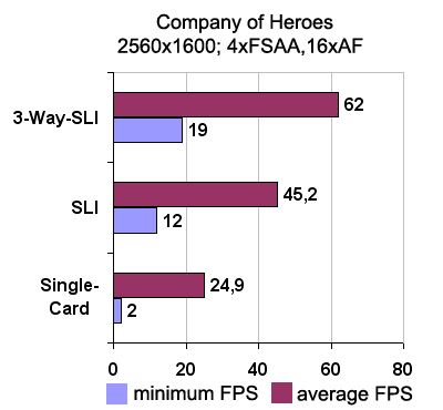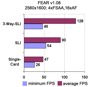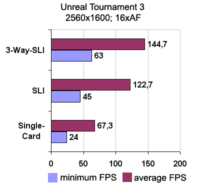 Производительность трех видеокарт неплохо масштабируется. Использование третьей видеокарты повышает производительность в среднем на 40% по сравнению с традиционным режимом SLI. А одиночная видеокарта медленнее связки из трех в 2,5 раза.