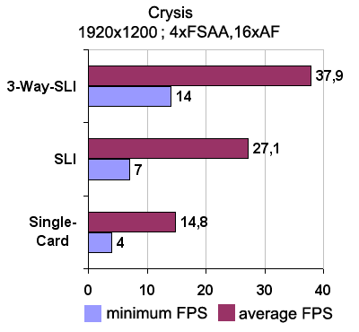 Немецкие коллеги с сайта www.pcgameshardware.de решили опробовать данную технологию на трех видеокартах Geforce 8800 Ultra в популярных игровых тестах. Тестовая конфигурация была следующая: