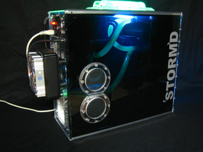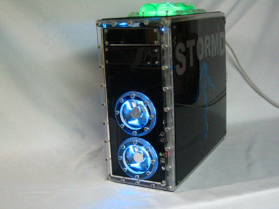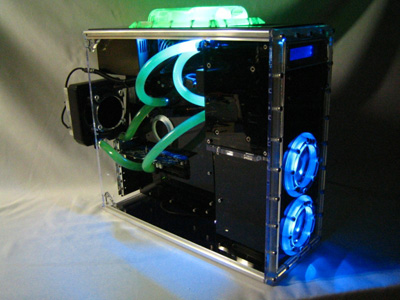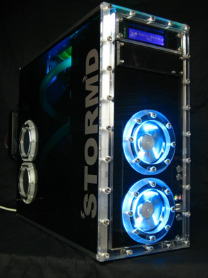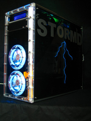 Основой для будущей работы послужил корпус Sunbeam LED UV blue plex. Первым делом автор взялся за переднюю панель, и вскоре на ней были установлены два 8-см светящихся вентилятора, которые окаймлены акриловой рамкой, сделанной умельцем собственноручно. Небольшая информационная панель отображает внутреннее состояние системы.