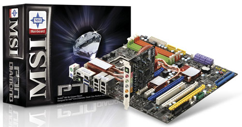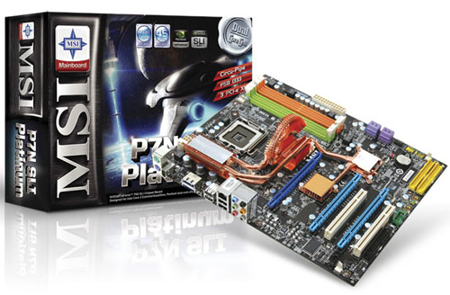 Старшая модель P7N Diamond основана на чипе nForce 780i. Соответственно, материнская плата поддерживает 3-way SLI в режиме х16 + х16 + х16. Но MSI установила целых четыре слота PCI-E для графических видеоадаптеров. Плата работает с памятью DDR2 частотой до 1066 МГц. Система охлаждения Circu-Pipe выполнена в виде массивного радиатора с тепловыми трубками. Звук не интегрирован, а выполнен в виде отдельной платы, подключаемой по интерфейсу PCI Express х1, на базе Creative X-Fi Xtreme. Эта модель имеет 6 разъемов SATA и два внешних eSATA. Все конденсаторы с твердотельным электролитом, выполненные по технологии POSCAP (на полупроводниковом органическом полимере).