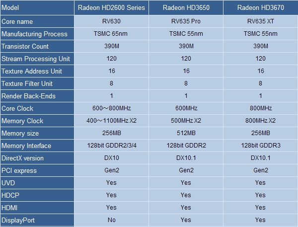 В лабораторию сайта ExpReview попала карта Radeon HD 3670 с 256 Мб памяти, ею было проведено сравнение с Radeon HD 2600 XT. Главным новшеством стал технологический процесс, по которому производится карта, теперь это 55-нанометровые нормы. В результате, площадь ядра уменьшилась на 20% и, как следствие, понизилось на 9 градусов тепловыделение. Кроме того, в данной карте нашлось место улучшенным функция энергосбережения: в состоянии покоя частоты работы GPU/памяти снижаются с номинальных 800/1600 МГц до 110/810 МГц. Основные характеристики представлены в таблице: