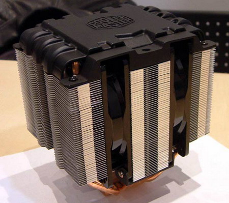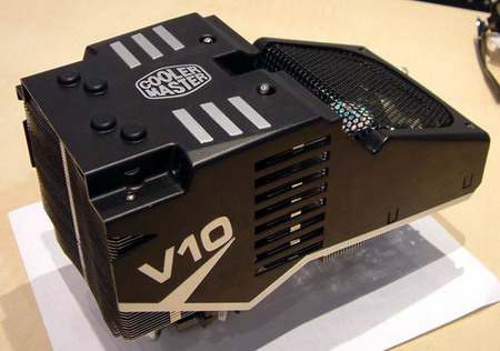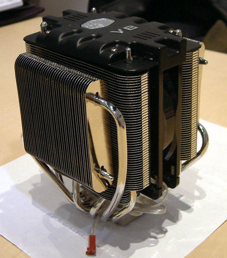 Наименьшим кулером из представленных CoolerMaster на выставке является модель V8. Хоть он на фоне собратьев и имеет небольшие габариты, «малышом» его назвать сложно. Радиатор V8, состоящий из 8 тепловых трубок, как бы разделен на две половины, между которыми разместился все такой же 120-мм вентилятор.