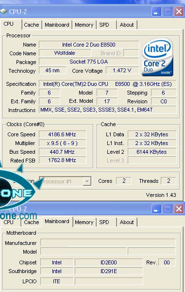 VR-Zone опубликовали результаты теста CPU-Z для сабжевой связки. Чипсет Intel P45 Express ожидается во втором квартале 2008 года и будет поддерживать 1333 МГц шину, 8 ГБ DDR3-1333 или 16 ГБ DDR2-800, 1x16 PCIe 2.0 или 2x8 PCIe 2.0 и ICH10/R. Как видно из скриншотов «вр-зоновцы» разогнали процессор «на воздухе» до 4,2 ГГц.