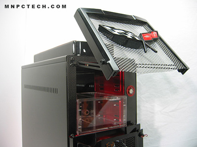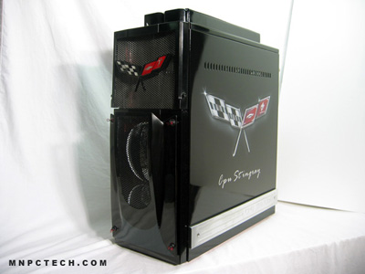 Еще одной яркой особенностью проекта является откидная дверца, которая прикрывает отсеки под 5,25-дюймовые приводы. Радиатор для системы водяного охлаждения разместился на верхней части корпуса, и для создания большего эффекта умелец прикрыл его сеткой с нанесенными на нее языками пламени. Стоит отметить, что два гриля к вентиляторам, размещенным на передней панели, являются уменьшенной копией моторного фильтра автомобиля Corvette 427.