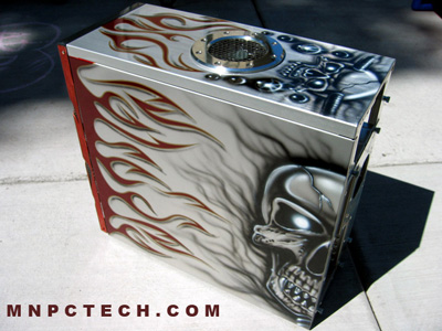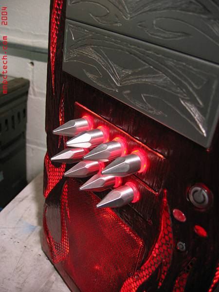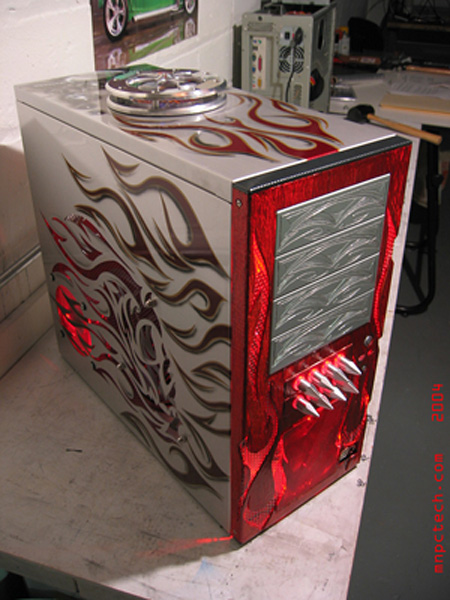 На верхней части корпуса установлен 8-см вентилятор, гриль для которого умелец сделал собственноручно. Заключительным этапом была установка красных неоновых ламп и нанесение потрясающей аэрографии.