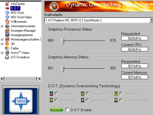 В качестве вербального представления степени разгона в CCC от MSI было использовано понятие «Командующий». В общем, круче, чем генерал ;) Если перейти на язык цифр – то это 878 МГц для GPU и 955 МГц для памяти. Собственно, все наглядно проиллюстрировано. Сообщается также, что все работало пристойно и стабильно,.. «но надо еще потестить»…