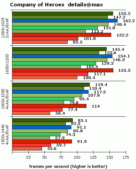 Company of Heroes. Небольшое преимущество при 1280x1024 теряется в высших разрешениях при включенном антиальясинге, правда во всех случаях разница незначительная- фактически, исследуемый выступает на одном уровне со своими ближайшими оппонентами.