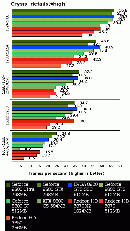При высокой детализации и разрешении Crysis практически не играбелен, включая и Ultra, в остальном же G92 в этой игре выглядит даже несколько предпочтительнее G80. Ну а бета-версия «вистовских» драйверов в XP для Dx10-приложения фактически провалили ATI HD 3870 X2.