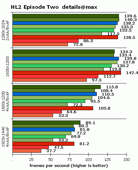 HL Episode 2. В высших разрешениях при включенных 4xAA/8xAF даже несколько быстрее, чем 8800 GTX.