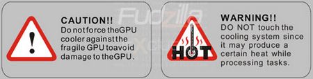 Интернет-ресурс Fudzilla сообщает, что в процессе работы кулер этой видеокарты может значительно нагреваться и приводит интересные фото наклеек с этих плат: