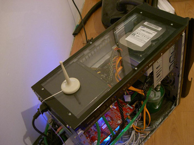 Как видим, корпус не представляет собой ничего сложного - большое, на всю боковую панель окно, которое открывает отличный обзор на внутренний мир системы. Качественная гравировка дополняет композицию и создает дополнительный декоративный эффект. На передней панели особое место занимает 12-см светящийся вентилятор. Вместо привычных пластмассовых заглушек на отсеках под 5,25-дюймовые устройства умелец установил стальную сетку.