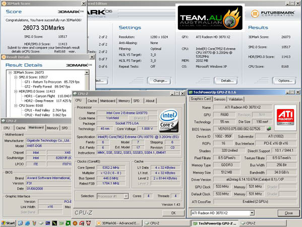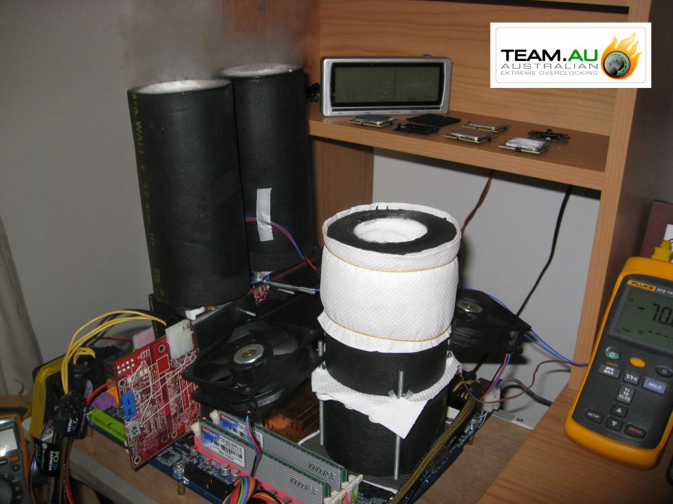 1066/1062 МГц GPU/RAM – таков результат разгона Radeon HD 3870 X2, оснащенной «двухкотловой» системой охлаждения на жидком азоте собственной конструкции от австралийского овера T_M. Вместе с аналогично охлаждаемым Core 2 Extreme QX9770 на частоте 5350 МГц результат в 3DMark06 составил 26,073 единиц. Отмечается, что потенциал системы не до конца исчерпан - вполне реально достигнуть результата известного овера Shamino на двух Radeon HD 3870 в CrossFire. Его результат - 28,313 при не менее серьезной аппаратной модификации оборудования: частота GPU превышала 1.2 ГГц.
