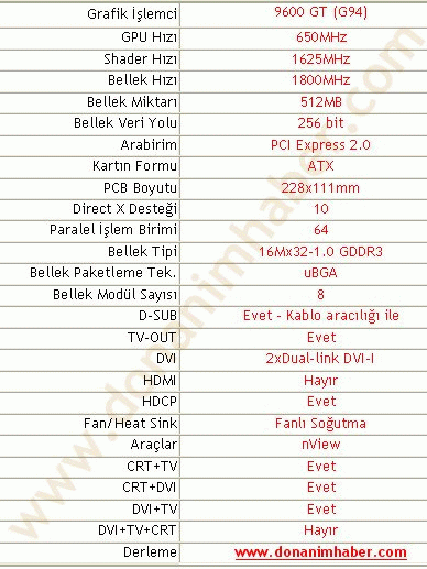 Ядро GeForce 9600 GT, под кодовым названием G94, работает на частоте 650 МГц, как и предполагалось ранее. Шейдерный блок тактуется на 1625 МГц, а видеопамять объемом 512 Мб работает на частоте 1800 МГц и набрана из модулей 16Мх32 GDDR3-типа с временем отклика 1,0 нс. Шина памяти имеет ширину в 256 бит.