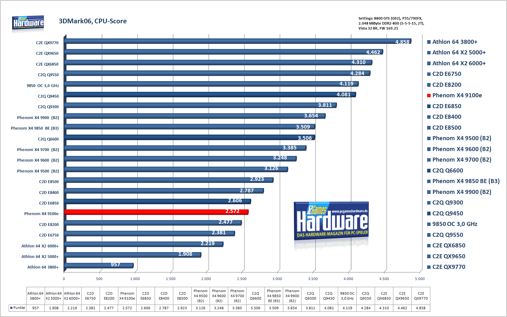 PCGH провел тестирование процессора Phenom X4 9100e и сравнил его быстродействие с популярными процессорами. К примеру, в популярном тесте 3DMark'06 процессор Phenom X4 9100e смог обойти двухъядерные C2D E6750 и C2D E8200. Хотя уступил процессорам C2D E6850 и C2D E8400. Но не будем забывать, о предполагаемой стоимости, если цена действительно будет в районе 140$ - есть все шансы на успех.