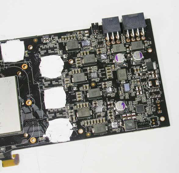 Как вы можете видеть, на лицевой стороне распаяны восемь микросхем памяти (некоторые скрываются под термопрокладками), кроме них, еще восемь находятся на обратной стороне платы. На карте присутствуют два разъема для подключения дополнительного питания - 8-ми и 6-контактный, распаян чип NVIO, также присутствую 2 SLI-коннектора, позволяющие организовать 3-way SLI. Размеры карты характеры для любого другого продукта топ-класса. Также можно обратить внимание на то, что при уставноке карта займет и соседний слот. Как стало известно, питание GPU будет 4-фазным, а памяти - 2-фазным.