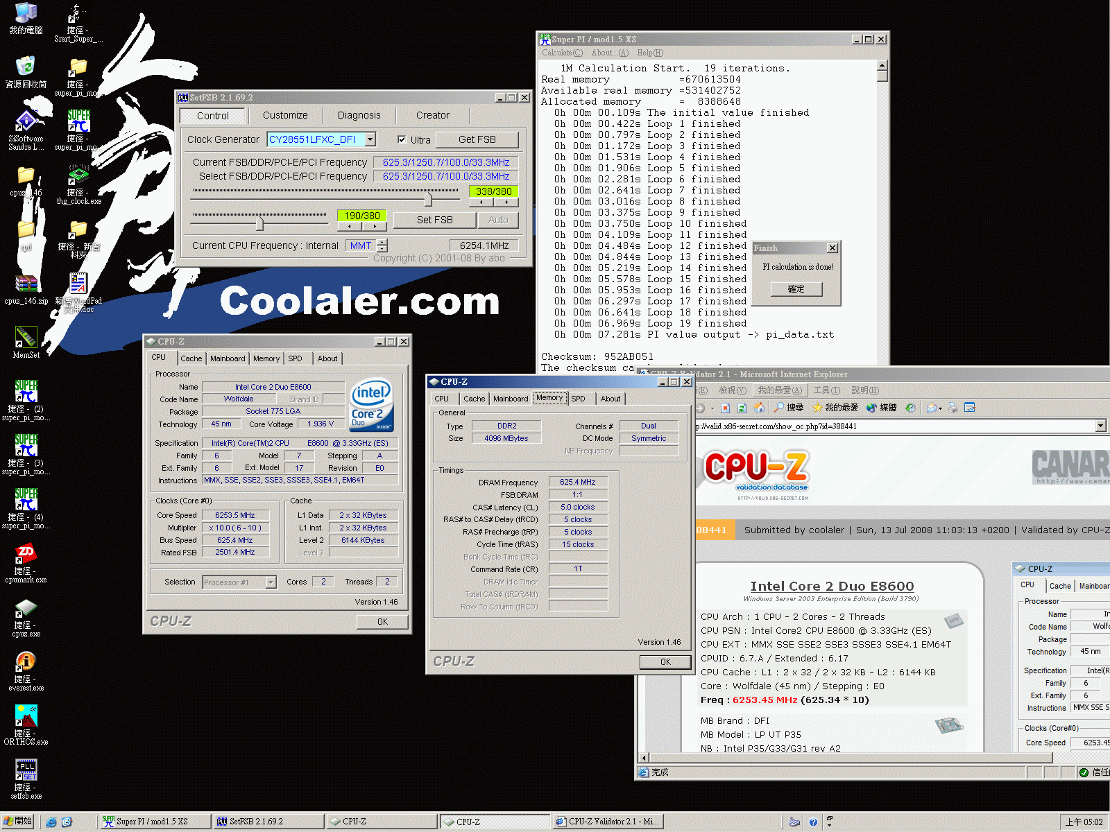 Наряду с отличным разгоном, тот же образец Core 2 Duo E8600 установил новый ориентир в вычислительном тесте Super PI 1M - 7,281 сек. Обращает на себя внимание значение параметра Command Rate оперативной памяти – 1T: