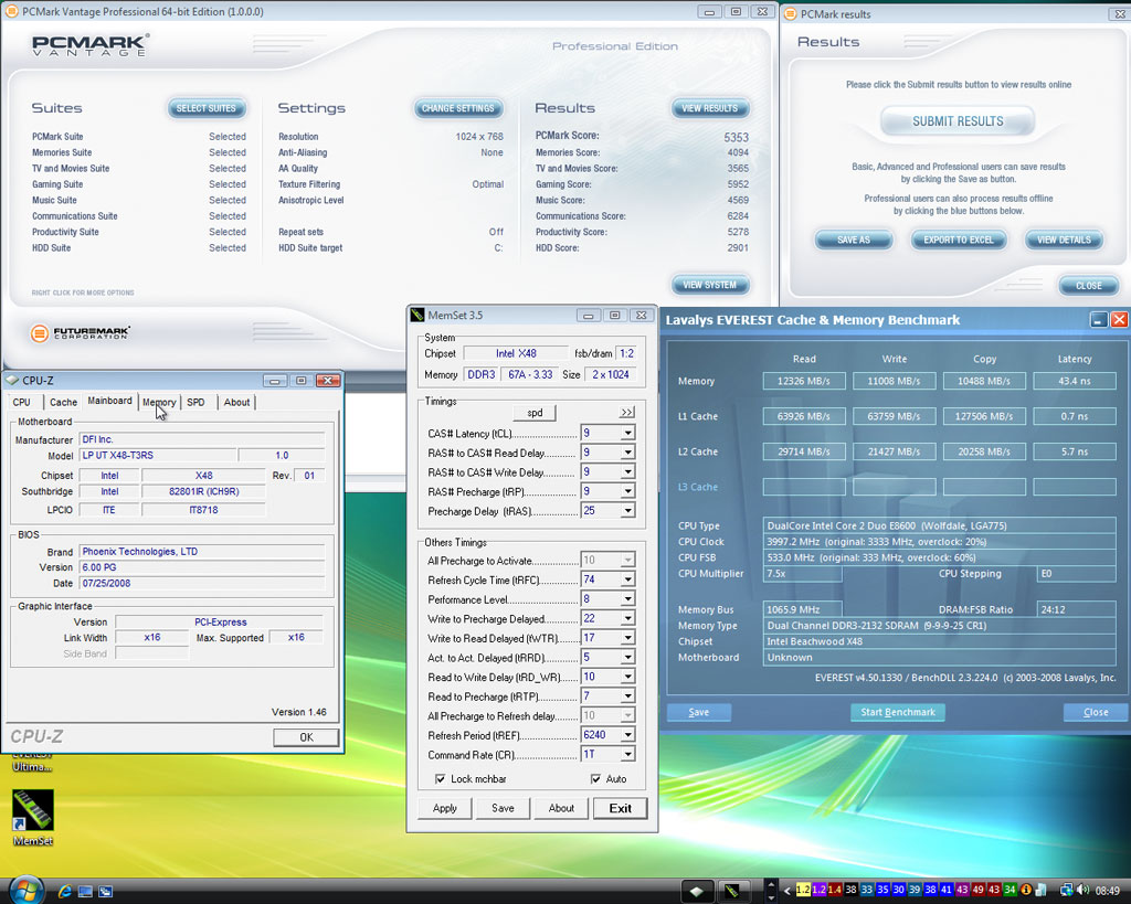 Экспериментальный стенд состоял из материнской платы DFI LanParty UT X48-T3RS и хорошо знакомого бенчерам процессора Intel Core 2 Duo E8600 степпинга E0. С сопутствующими настройками BIOS можно ознакомиться здесь.