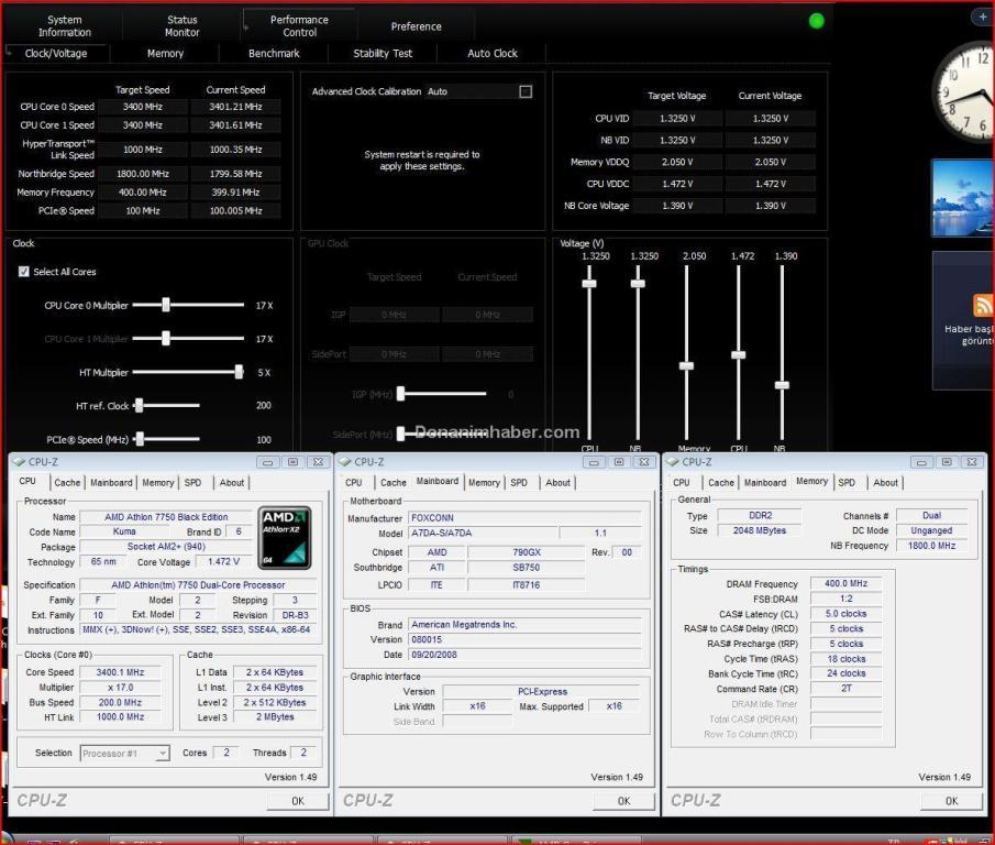 Поводом для оптимизма стал оверклокерский потенциал нового процессора. На стандартном напряжении экземпляр, попавший в лабораторию Donanim Haber, смог покорить рубеж в 3,1 ГГц. Разгон весьма положительно сказался на производительности: на данной частоте Athlon X2 7750 кое-где смог обойти даже Core 2 Duo E8300.