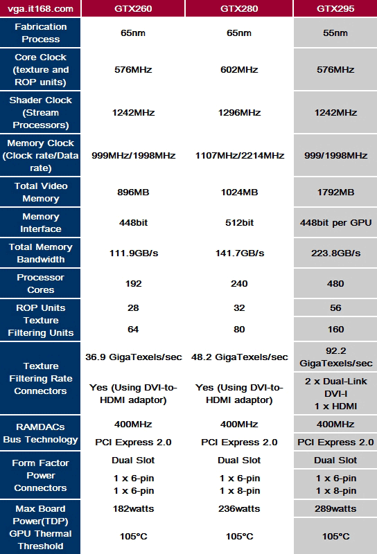 О характеристиках GeForce GTX 295 мы писали уже не раз. Свежие сведения о количестве потоковых процессоров, ширине шины памяти и энергопотреблении полностью подтверждают более ранние прогнозы. Частоты GTX 295 соответствуют параметрам GTX 260 – 576/1242/999(1998) МГц (напомним, данная видеокарта изначально упоминалась под именем «GeForce GTX 260 GX2»).