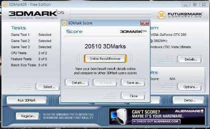 Что касается результатов проверки синтетическими бенчмарками, то в 3DMark05 система на базе GeForce GTX 285 и процессора Intel Core i7-920 набрала 20510 баллов.