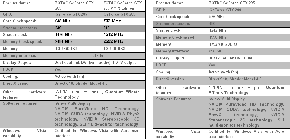 Обе видеокарты, по аналогии с GeForce GTX 280, располагают 240 потоковыми процессорами, 1 ГБ памяти стандарта GDDR3 и 512-битным мемори-контроллером.