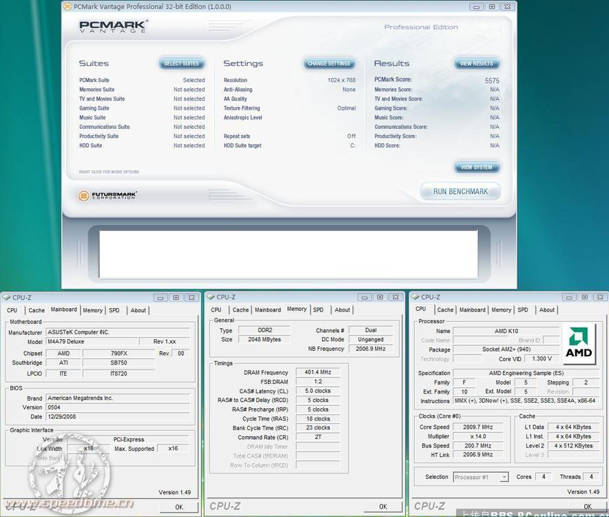 Компанию Athlon X4 @ 2,8 ГГц составили: материнская плата ASUS M4A79-Deluxe, 2 х 1 ГБ памяти DDR2-800 CL5 5-5-18 2T и видеокарта GeForce GTX 285. Тесты запускались под управлением 32-битной ОС Windows Vista.