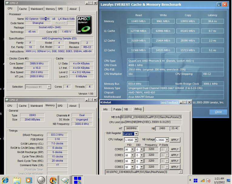 Высокий множитель (16x) и постоянная отладка нового для AMD 45-нанометрового техпроцесса не могли не сказаться на разгонных возможностях этого четырехъядерника. В результате он покорил планку 3,6 ГГц на номинальных 1,25 В, а сравнительно безопасный вольтаж 1,45 вольт обеспечил прибавку еще в 400 МГц.