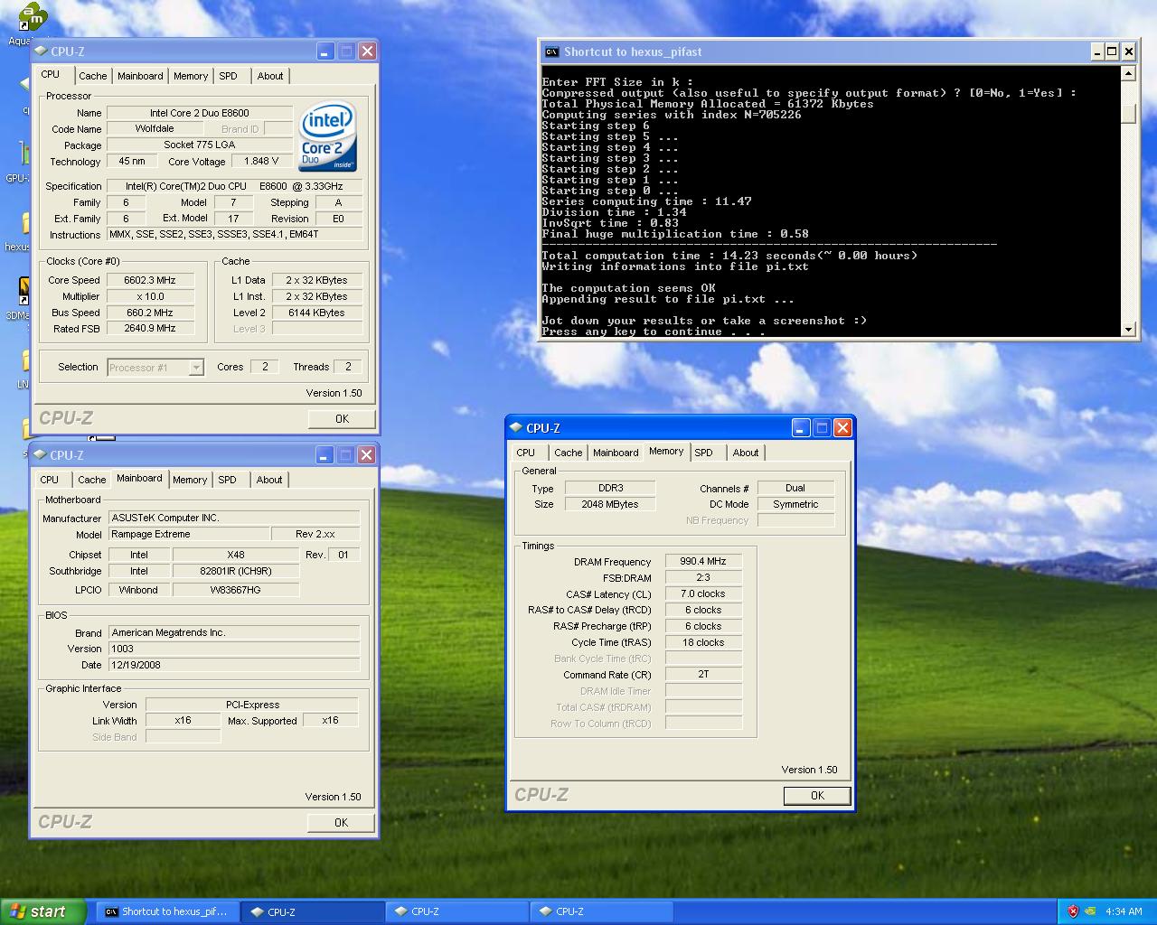 Для штурма вершины были использованы процессор Core 2 Duo E8600 батча Q822A435, сумевший взять частоту в 6602 МГц при температуре -144 градуса по Цельсию, материнская плата ASUS Rampage Extreme X48 c 1,81 В на северном мосту, память Corsair DDR3 серии Dominator @ 1981 МГц (тайминги CL7 6-6-18 2T) и блок питания Corsair HX1000W.
